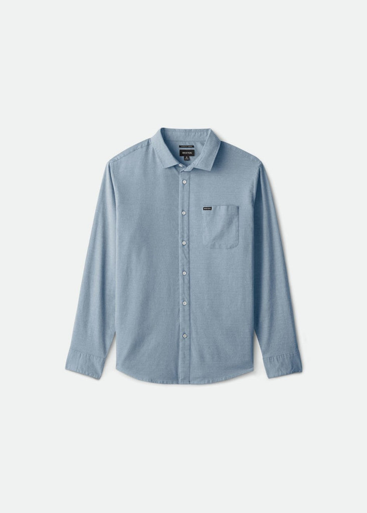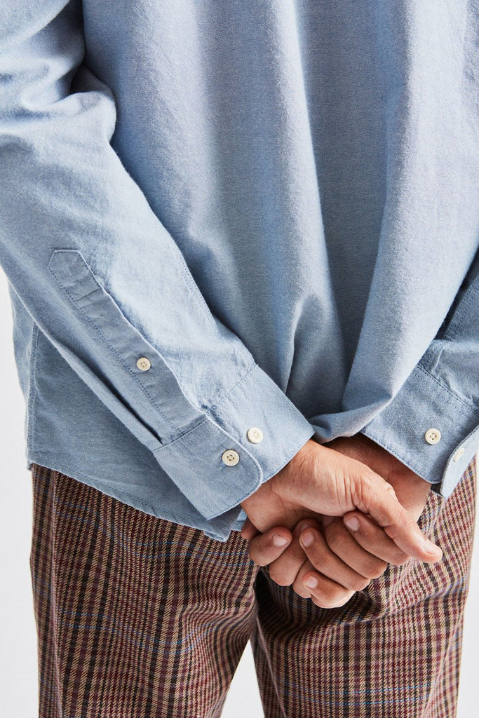 A long-sleeved button shirt made in 4-oz. cotton/polyester Oxford fabric with a custom softener wash.