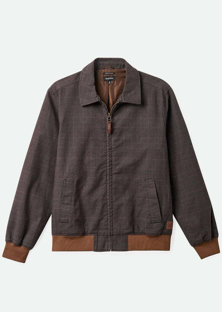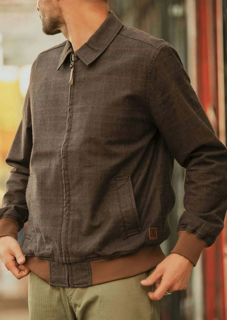 Military inspired menswear. Our military-inspired Dillinger Houndstooth Bomber Jacket updated in classic menswear styling. It is made from a yarn dyed houndstooth fabric with ribbed details at the cuffs and bottom opening. Featuring welt pockets and a vegan leather patch