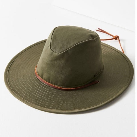 The Brixton Ranger Hat in Olive is a classic straw hat with a wide brim, completed with a leather strap and a removable metal Brixton Feather pin.