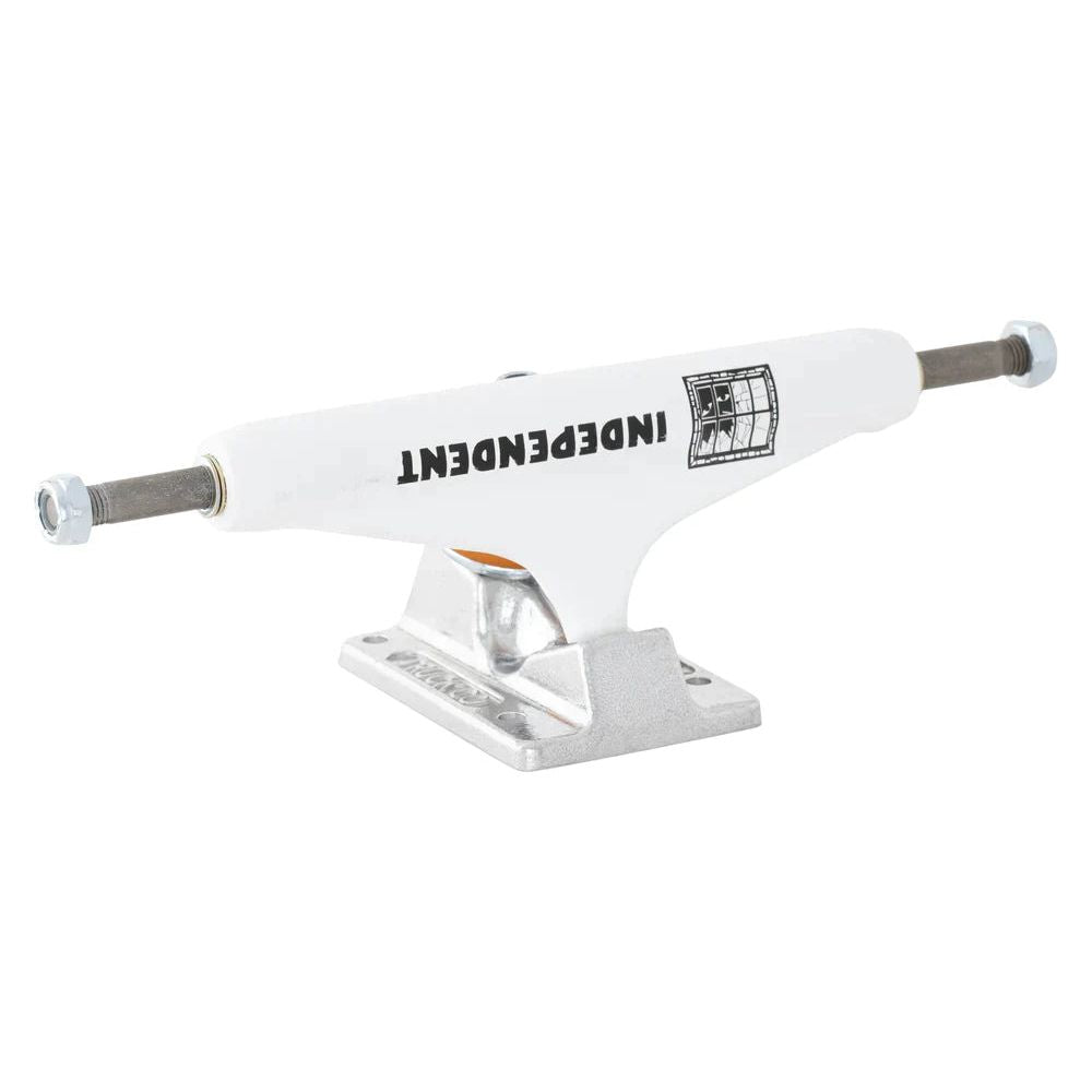 Independent Evan Smith Pro Stage 11 Standard trucks featuring flat white powder coated hanger with pad printed broken window graphic, polished silver baseplate with shattered glass pad print on kingpin housing, silver hardware, and orange cushions.