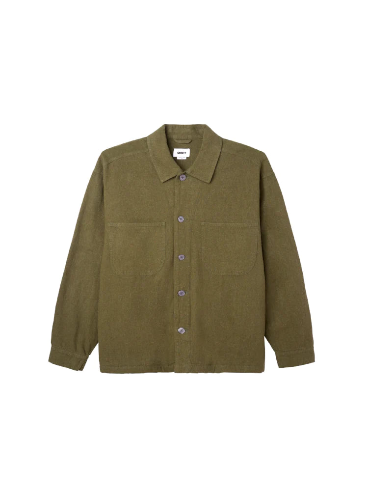 A crinkled linen utility shirt jacket with front placket pearlized button closure and front chest patch pockets. Side seam pocket entries, single pearlized button at cuffs and OBEY side seam flag label.