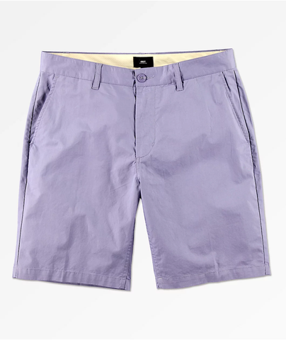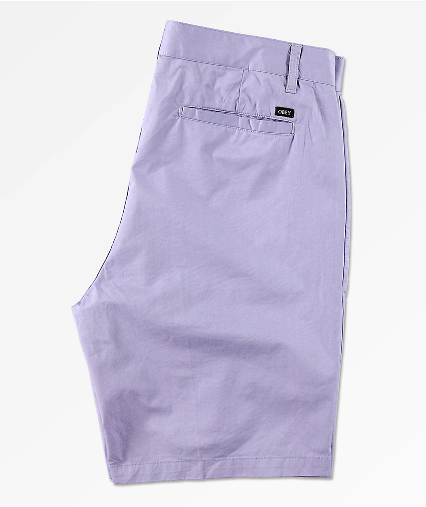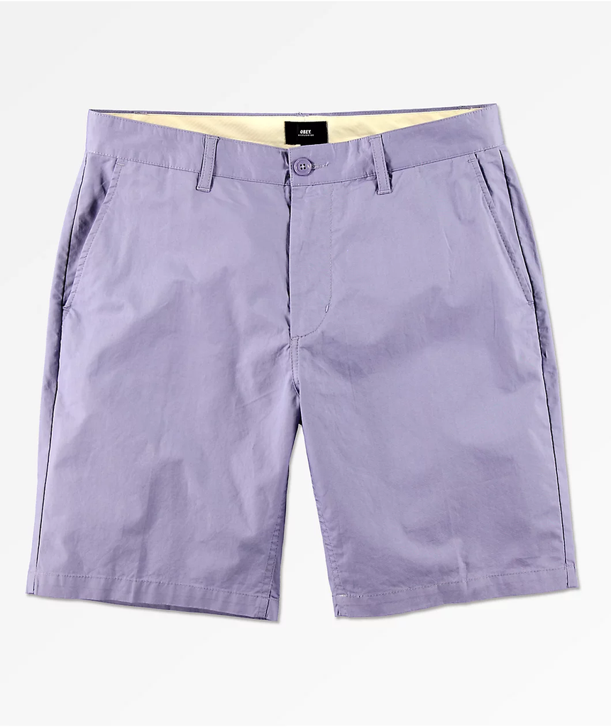 Finish off your warm weather style in the fun and fresh Straggler Lavender Chino Shorts from Obey. Coming in a unique lavender colorway, these chino-style shorts feature a four pocket configuration for a classic silhouette. A pure cotton construction and relaxed fit makes these shorts light and comfortable when the hot weather hits, while the Obey branding throughout offers a signature look that you won't want to miss out on