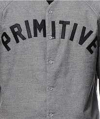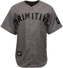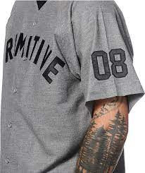 A classic baseball jersey look with a soft design that sports a black "Primitive" and "00" embroidery on the chest and sleeve with raglan sleeves.