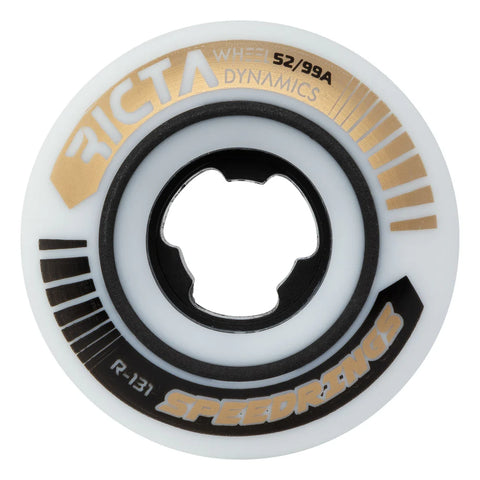 Ricta Speedrings' give you the feel of a traditional wheel with the speed and reduced rolling resistance of a cored wheel. The unique core design puts urethane around the bearing bore like a non-cored wheel and the inner core design helps maintain shape integrity when landing tricks for quick rollaway.