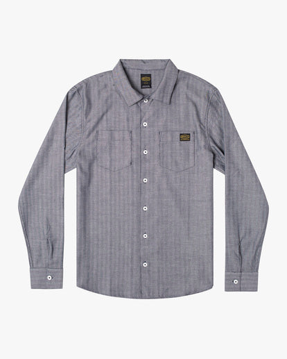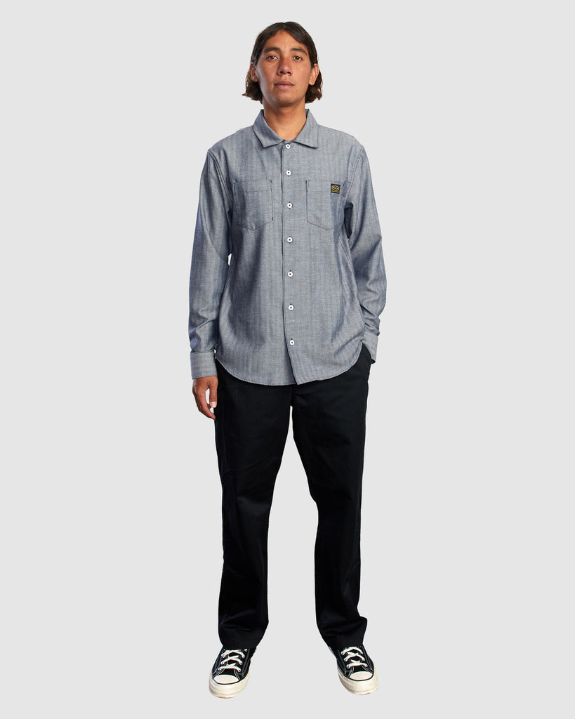 EFFORTLESS STYLE MEETS CLASSIC DESIGN IN THE RVCA DAY SHIFT LONG SLEEVE TEE, MADE FROM POLYESTER COTTON TWILL FABRIC IN A RELAXED FIT FOR A SHARP, EASY LOOK. THIS MEN’S LONG SLEEVE SHIRT IS BUILT WITH A BUTTON FRONT CLOSURE, CAMP COLLAR, SLIGHTLY SCALLOPED HEM AND DOUBLE CHEST POCKETS FOR ALL YOUR NEEDS. FINISHED OFF WITH RVCA RECESSION COLLECTION TRIMS THROUGHOUT.