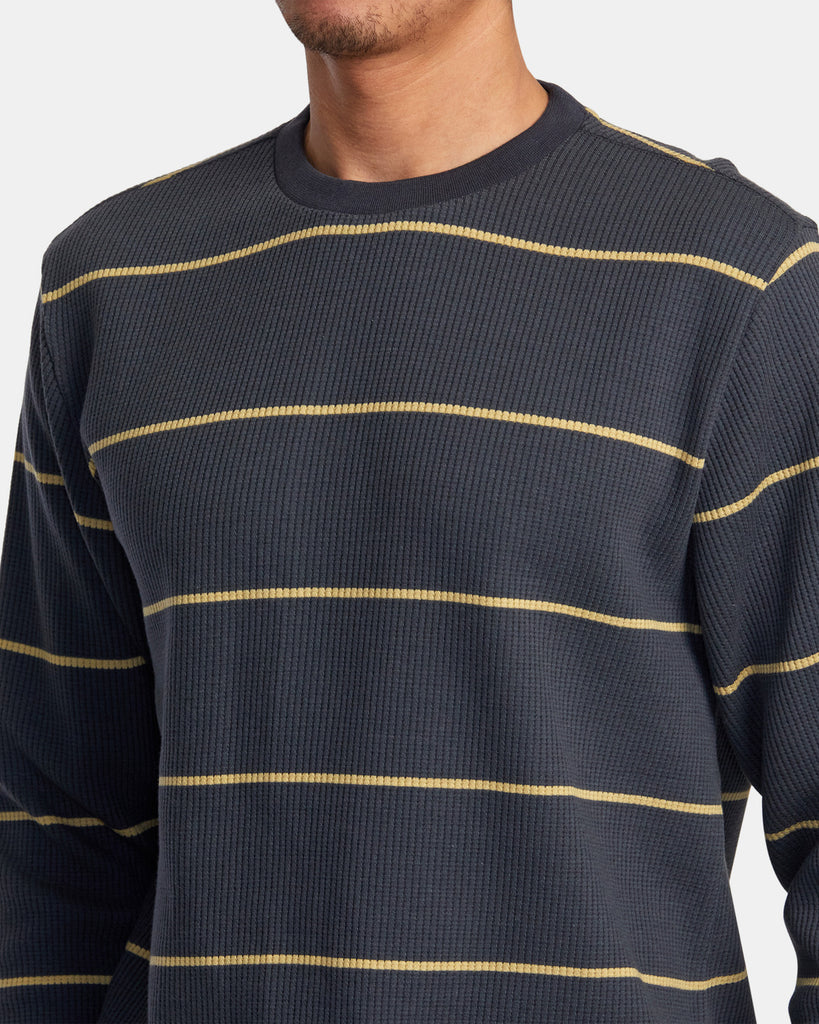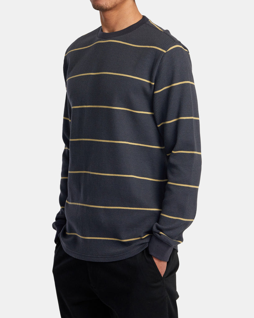 Boost your warmth and your daily style with RVCA Men's Dayshift Collection Dayshift Thermal Stripe Long Sleeve Top. Crafted of cozy waffle fabric, this classic crew neck shirt comes in a new range of colorways with yarn-dyed stripes.