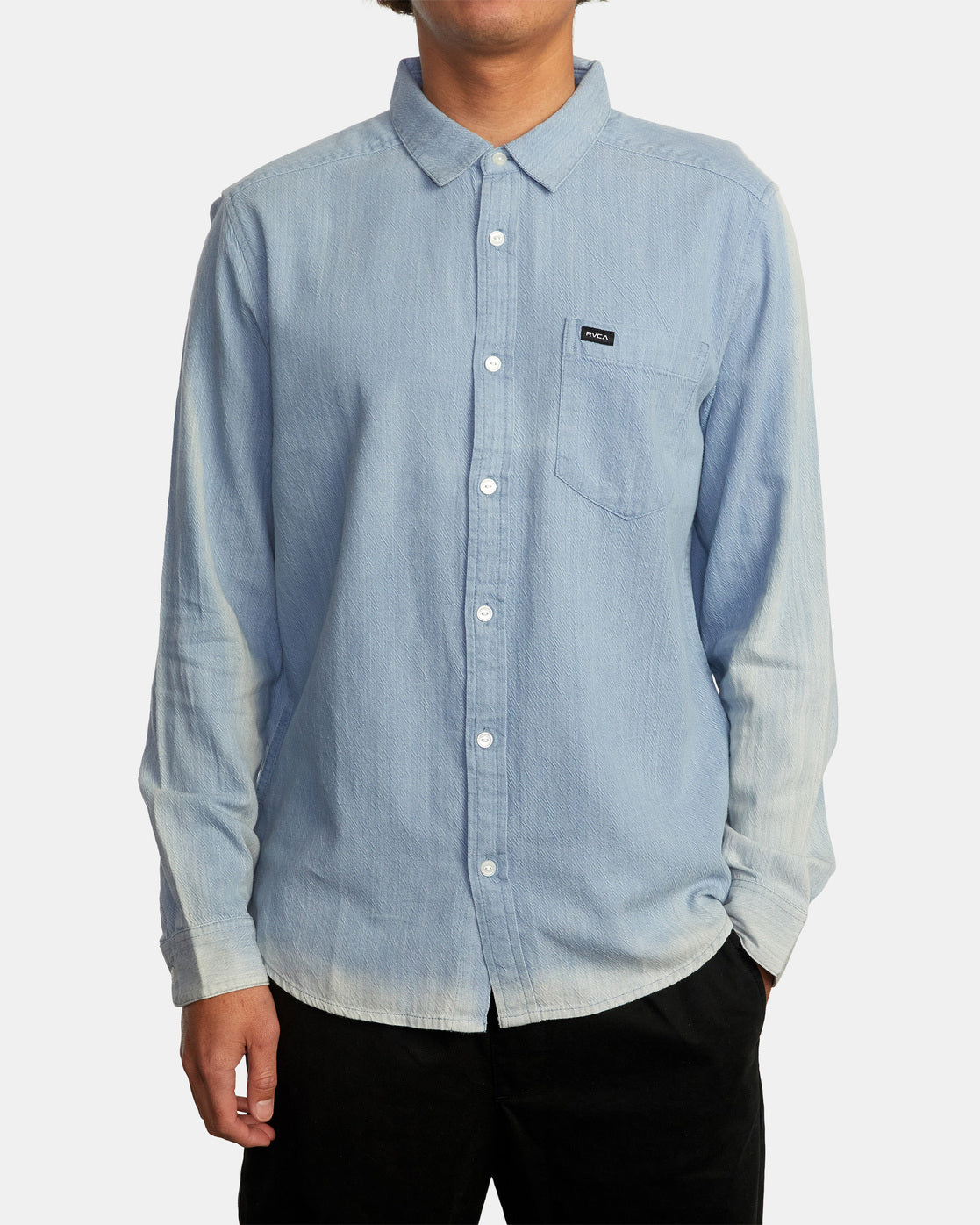 AN ESSENTIAL CLOSET STAPLE, THE RVCA HARBOUR LONG SLEEVE SHIRT KEEPS YOU COMFORTABLE IN STYLE. MADE FROM COTTON DENIM POPLIN, THIS MEN’S BUTTON-UP SHIRT FEATURES A TRADITIONAL COLLAR, SCALLOPED HEM, LONG SLEEVES AND SINGLE CHEST POCKET FOR ALL YOUR NEEDS. TOPPED WITH A SIGNATURE RVCA SOLO LABEL AT THE CHEST POCKET HEM.