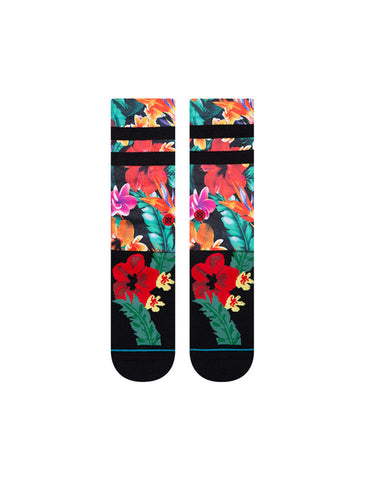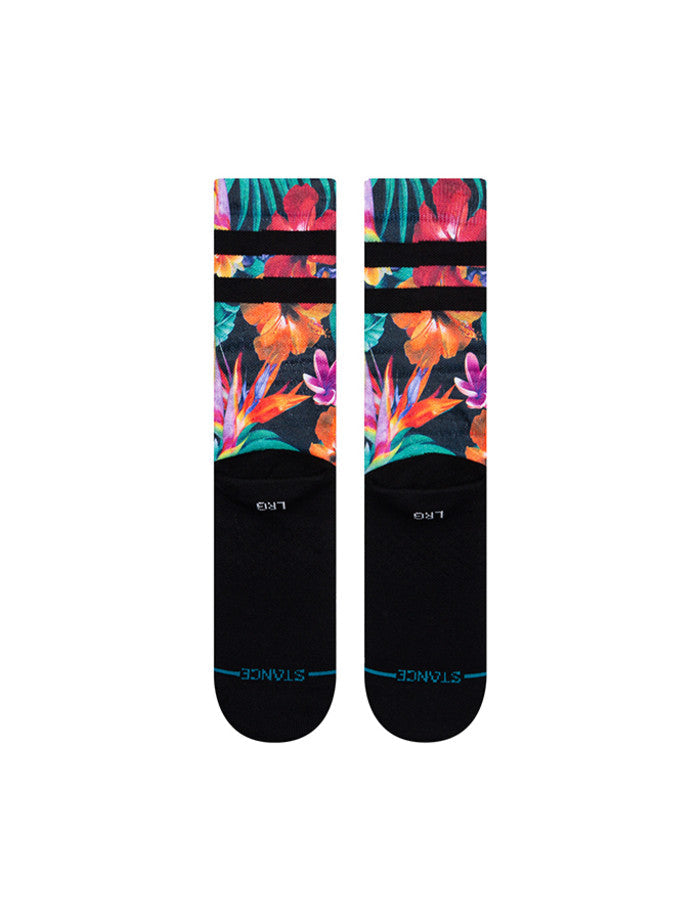 Tropical florals rooted in black with an extra set of black racing stripes up top... welcome to island of Pau! A fun little polly blend crew with just enough mid-cushion to keep that vacation vibe alive.