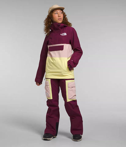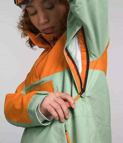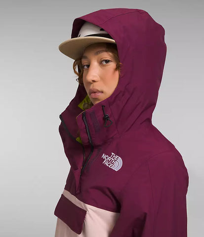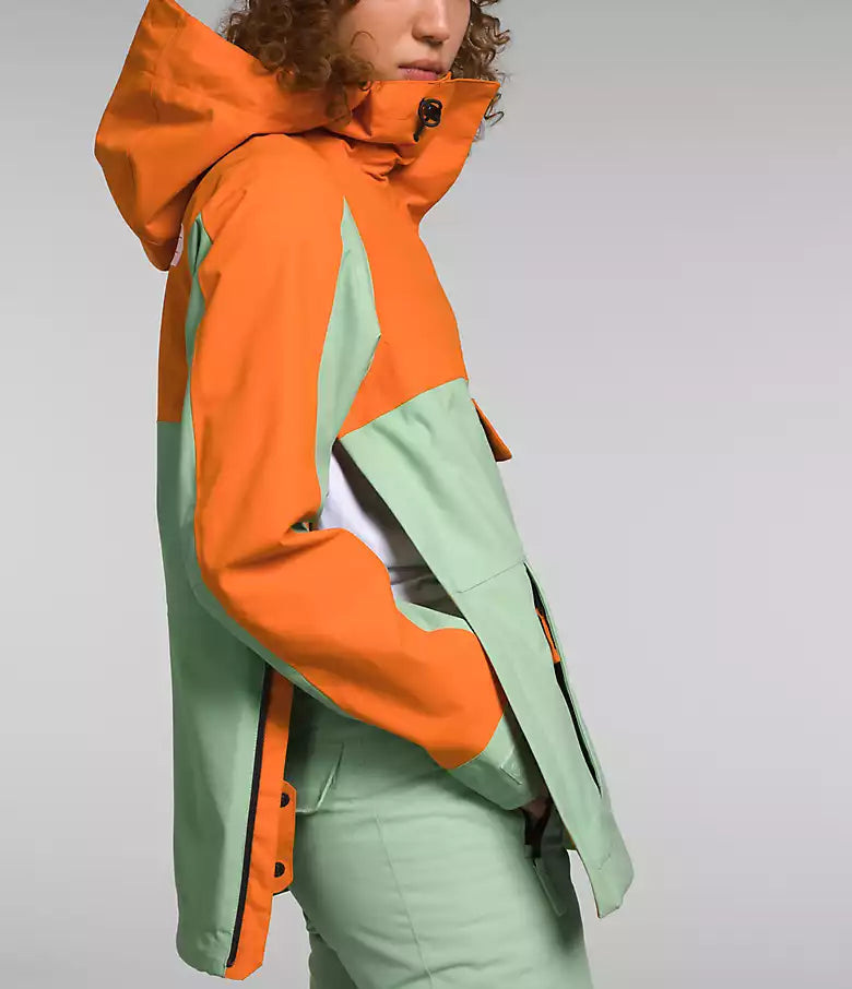 The Women’s Driftview Anorak uses a waterproof, seam-sealed DryVent™ fabric and an attached, helmet-compatible hood for full on-mountain coverage. Stacked kangaroo pockets provide on-the-go storage, and the side entry design makes it easy to remove when back at the lodge.