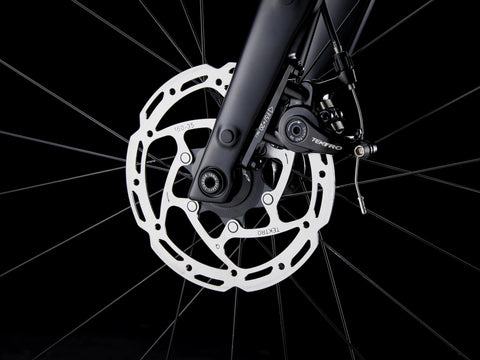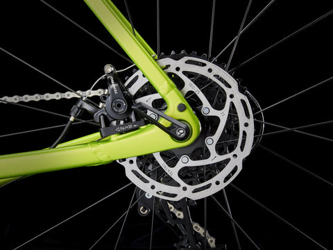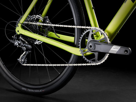 A responsive 300 Series Alpha Aluminum frame, hidden cables that won't interfere with bags, integrated rack, fender, and frame bag mounts, a 1x11 speed SRAM Apex drivetrain for smooth shifting on punchy climbs and variable terrain, mechanical disc brakes for ease of stopping quick in all conditions, tubeless ready rims, and wide Bontrager GR1 Team Issue 700x40c gravel tires for added comfort and traction.