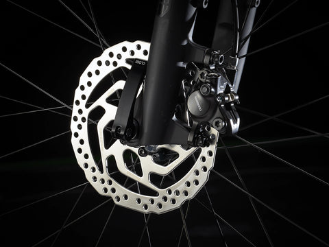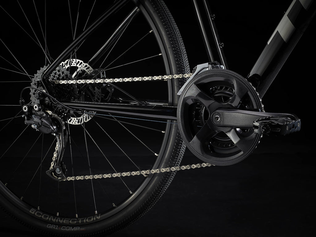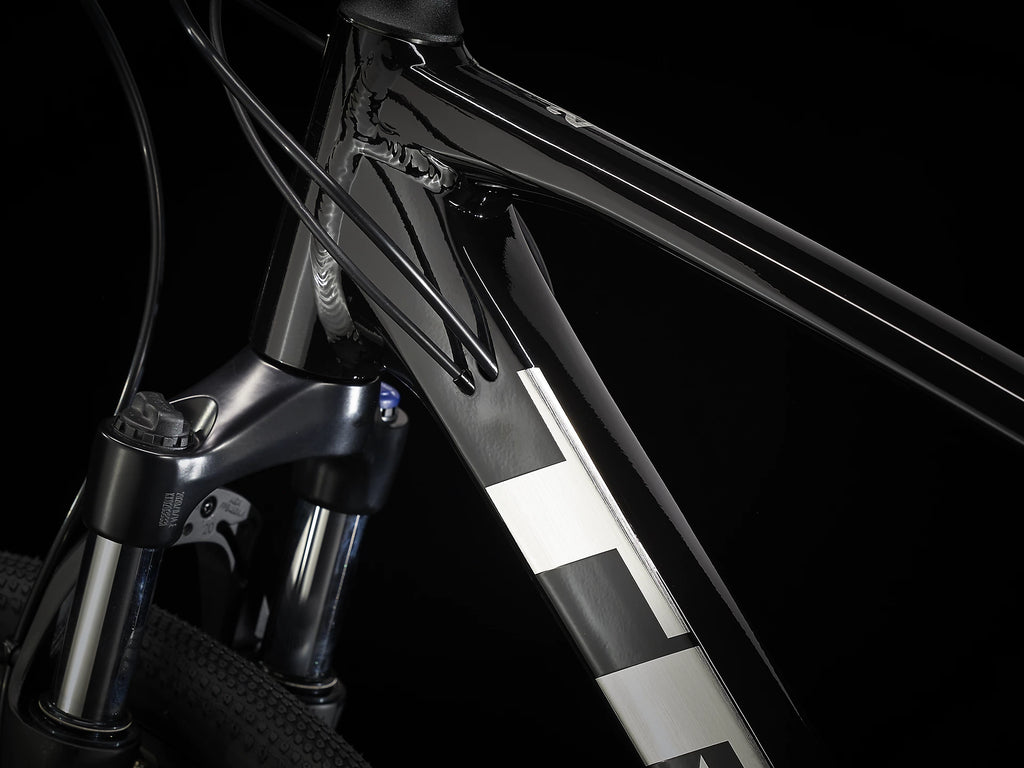 A sturdy aluminum frame with sleek internal cable routing, a suspension fork with a lockout, a reliable 2x9 drivetrain with a wide range of gearing so you're never pedaling too hard or too soft, all-terrain tires that are grippy yet fast-rolling, and powerful hydraulic disc brakes for all-weather stopping power.