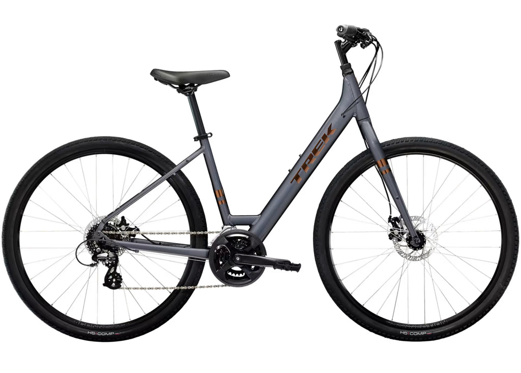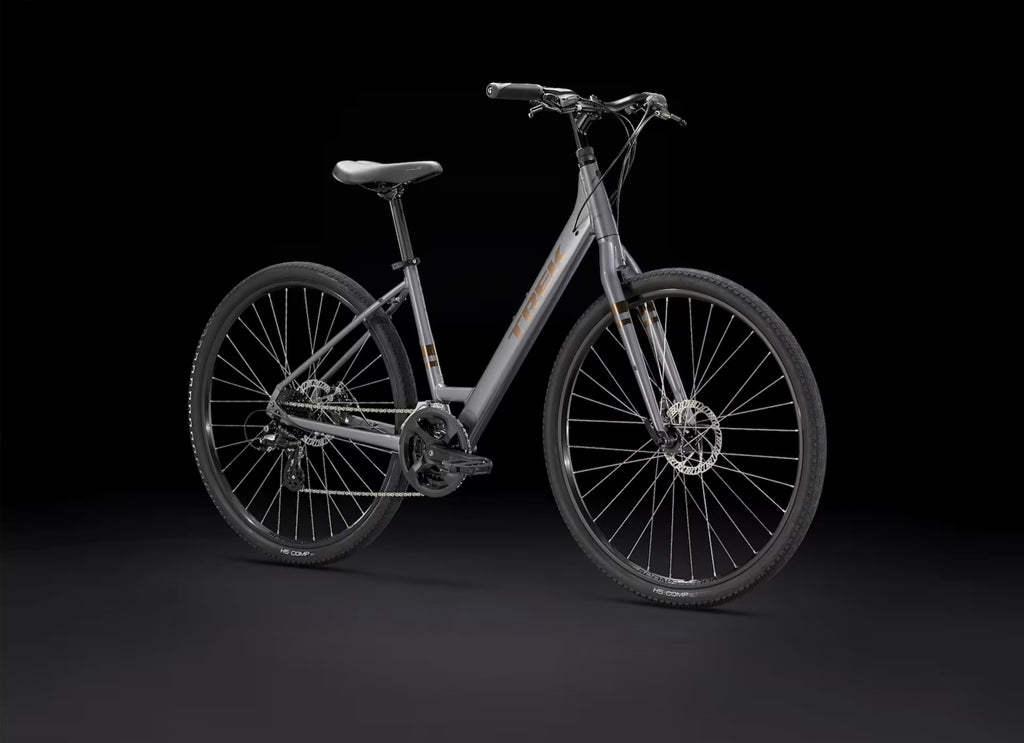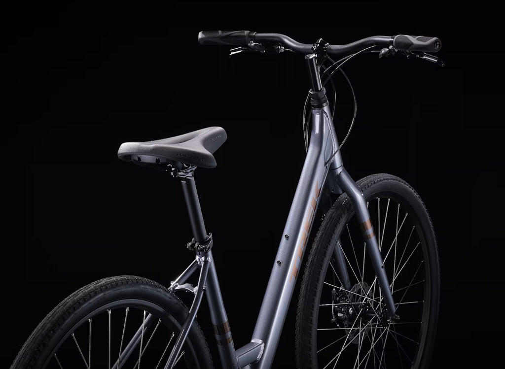 A lightweight aluminum frame with mounts for a rack and fenders, a lowstep design that makes it especially easy to mount and dismount, 16 speeds to help you conquer varied terrain, ergonomic grips, a Bontrager padded saddle, wide 45c tires for added stability, powerful disc brakes, and a geometry that keeps you in a comfortable, upright riding posture.