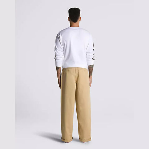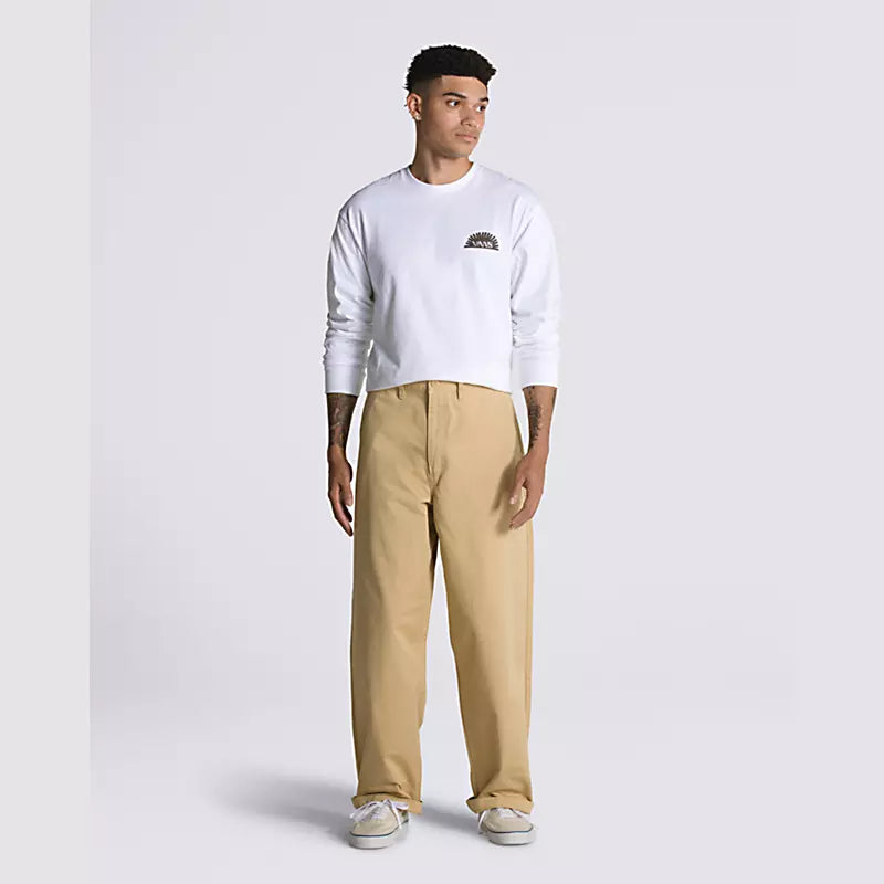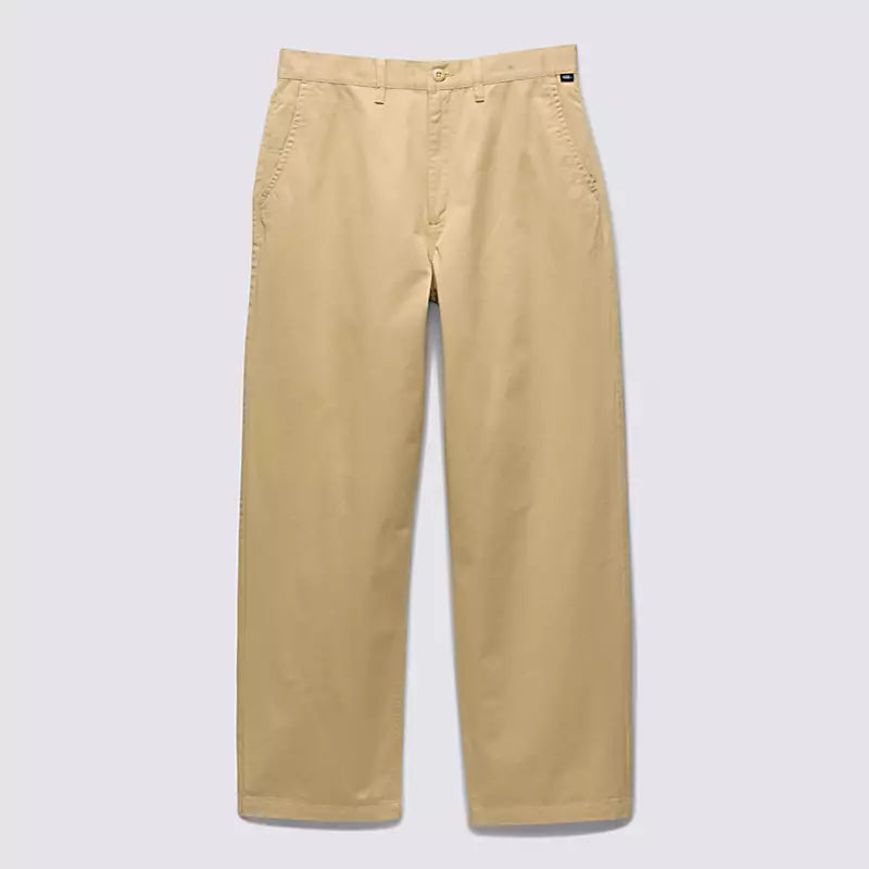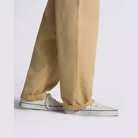 Fit, style, and durability—the Authentic Chino Fit. We put a lot of thought into our pants, so you don’t have to. A versatile chino pant that delivers style and functionality at an affordable price, the Authentic Chino Baggy Pant lets you stop worrying about your gear and focus on your skating. Built with a rigid cotton twill fabrication, this baggy chino pant features classic chino front hand pockets with a new coin pocket placement on the right, rear welt pockets with button closures, and embroidered Drop V bartacks for reinforcement with a heritage twist. Plus, new details bring plenty of Off The Wall style to this skate essential, including the new “V” belt loop detail on the back waistband, the new checkerboard twill taping on the internal fly facing, and the new flag label sewn internally to the hem seam for added branding when legs are cuffed.