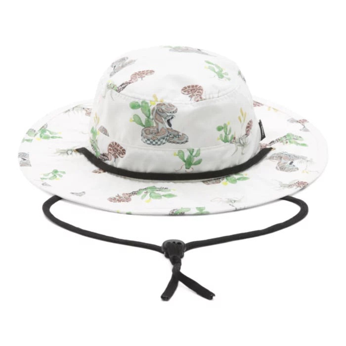 Featuring an allover print for an elevated look, the Boonie Bucket Hat offers a fresh twist on an iconic style. This 100% polyester bucket hat is finished with a contrast rope, cinch, and Vans flag label on the seam.