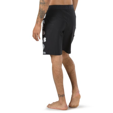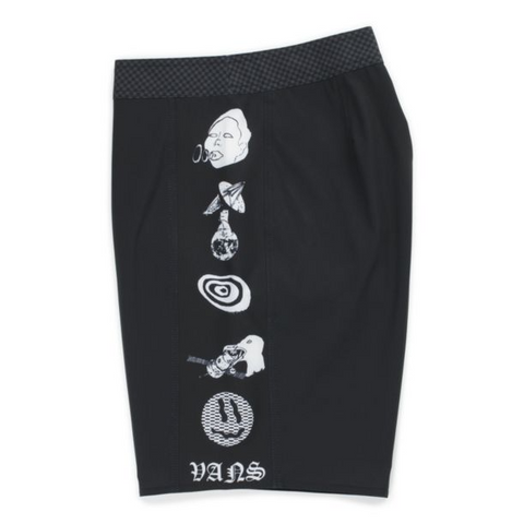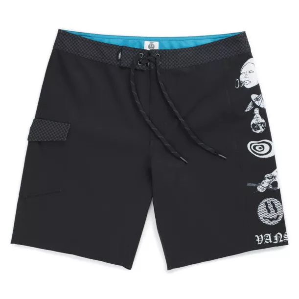 Crafted from premium 90% polyester and 10% elastane Sturdy Stretch fabric and coated with a water-resistant finish, the Wade Goodall 19 '' Fully Stretch Offset Boardshort performs like no other in the water or on the beach. . With a fabric that strikes the perfect balance between stretch, lightness and durability, the Offset boardshort also features side stripes with a hand-crafted cosmic design by Wade, as well as a side pocket with velcro strap and woven label. Vans on the side seam.