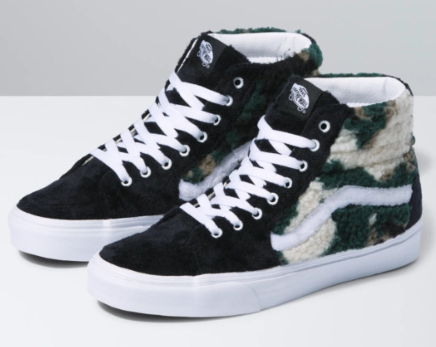 The Sk8-Hi was introduced in 1978 as Style 38, and showcased the now-iconic Vans Sidestripe on a new, innovative high top silhouette. As only the second model featuring the recognizable marker formerly known as the “jazz stripe,” the Sk8-Hi brought a whole new look to the Vans family. Building on that first legendary high top, the Sherpa Sk8-Hi features sturdy textile uppers with a camouflage print and Sherpa details. This lace-up shoe also includes re-enforced toe caps, supportive padded collars, and signature rubber waffle outsoles.